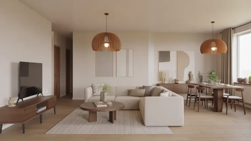Example: A light gray sofa and beige dining chairs with colorful accent pillows create a serene yet vibrant look.